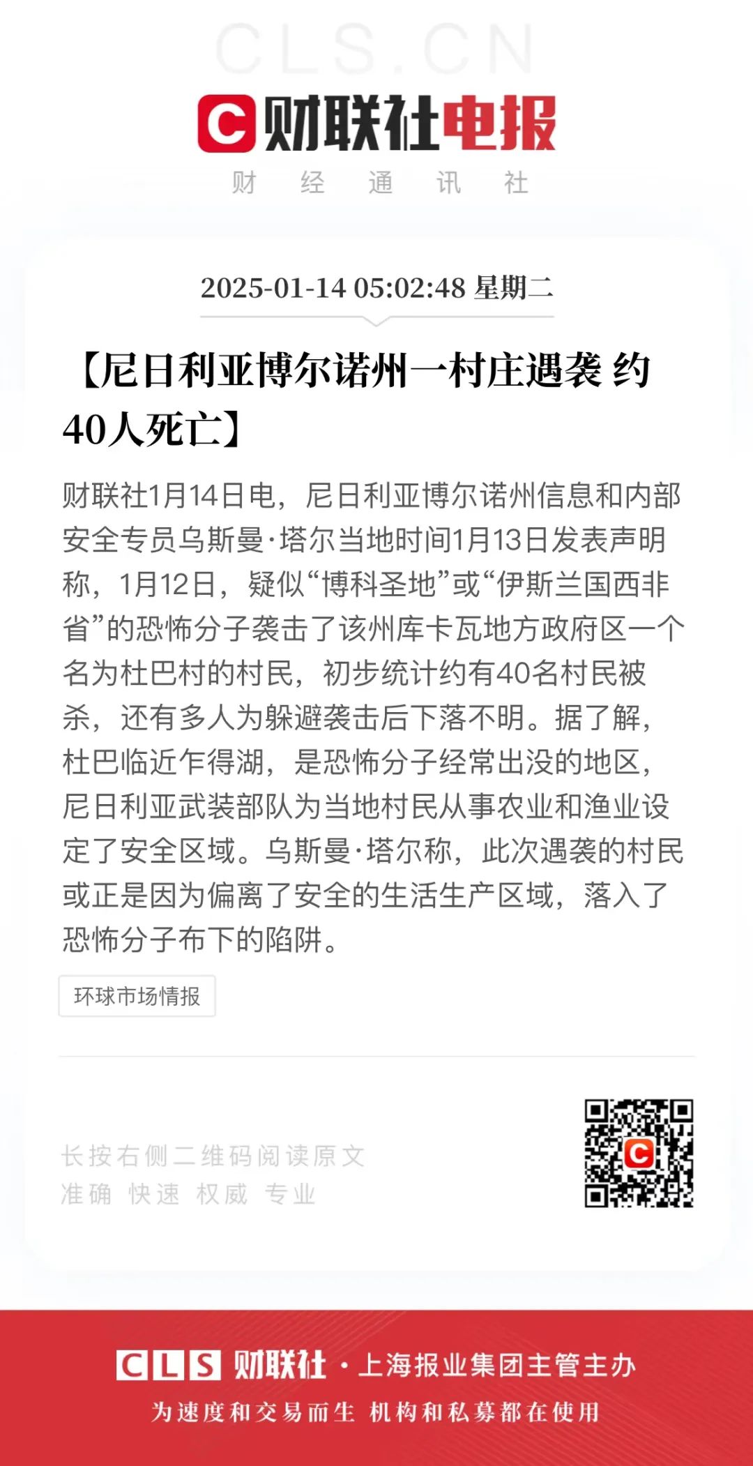 当地时间1月13日,尼日利亚博尔诺州信息和内部安全专员乌斯曼·塔尔发表声明称,1月12日,疑似“博科圣地”或“伊斯兰国西非省”的恐怖分子袭击了库卡瓦当地政府区一名名为杜巴村的村民。据初步统计,约有40名村民被杀,许多人在袭击后失踪,以避免袭击。