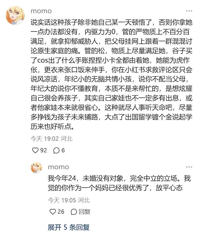 光看上面momo老师的个人资料页面,你能想到她在亲子关系帖子下面的人间清醒吗?
