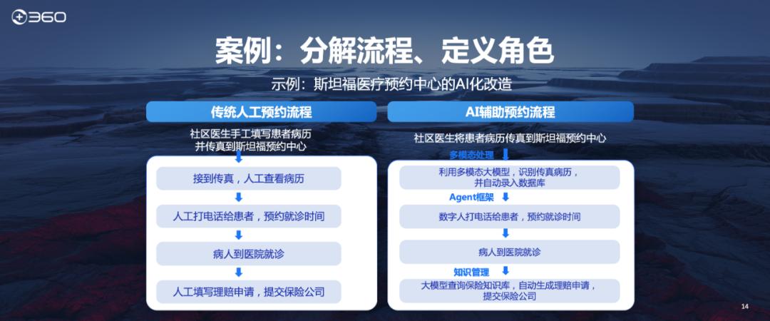 这三件事都是刚才说的很繁琐、很累人、很重复的工作,过去非人干不可,直到他们打造了三个智能体:一个智能体专门看传真,因为它有多模态,能够识别手写,能识别图像,把传真录到数据库里;一个智能体也有生成能力,能听得懂人话,给对方打电话,不聊风花雪月,不会漫无边际,就是约来看病的时间;第三个智能体是拿医院里原有的几万份报告,训练一个垂直大模型,专门给保险公司写报告,这就不是外面通用的大模型能干的事情。这三个智能机引入之后,他们减少100多人的队伍,这就是降本和增效。