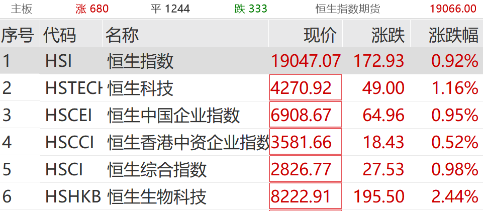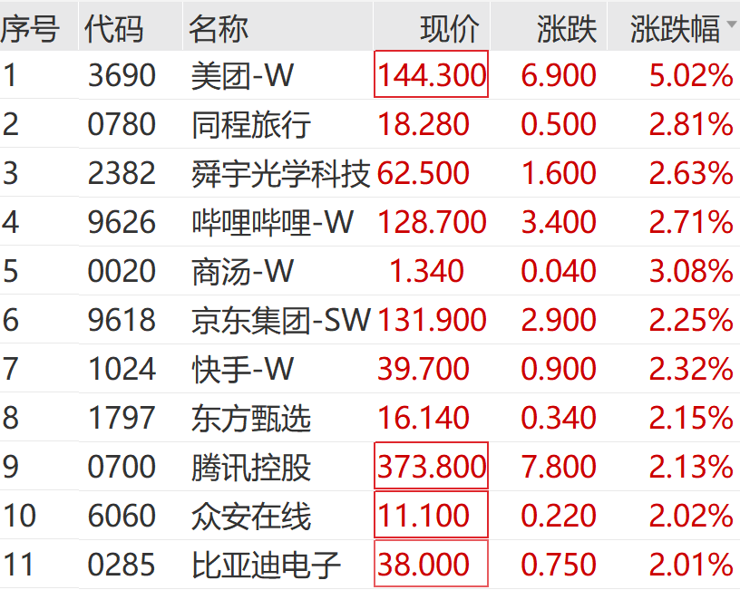 港股三大指数上午开盘红色,上午同步上涨。截至发稿时,恒生科技指数上涨超过1%;美团涨幅超过5%,领涨恒生科技指数成分股。