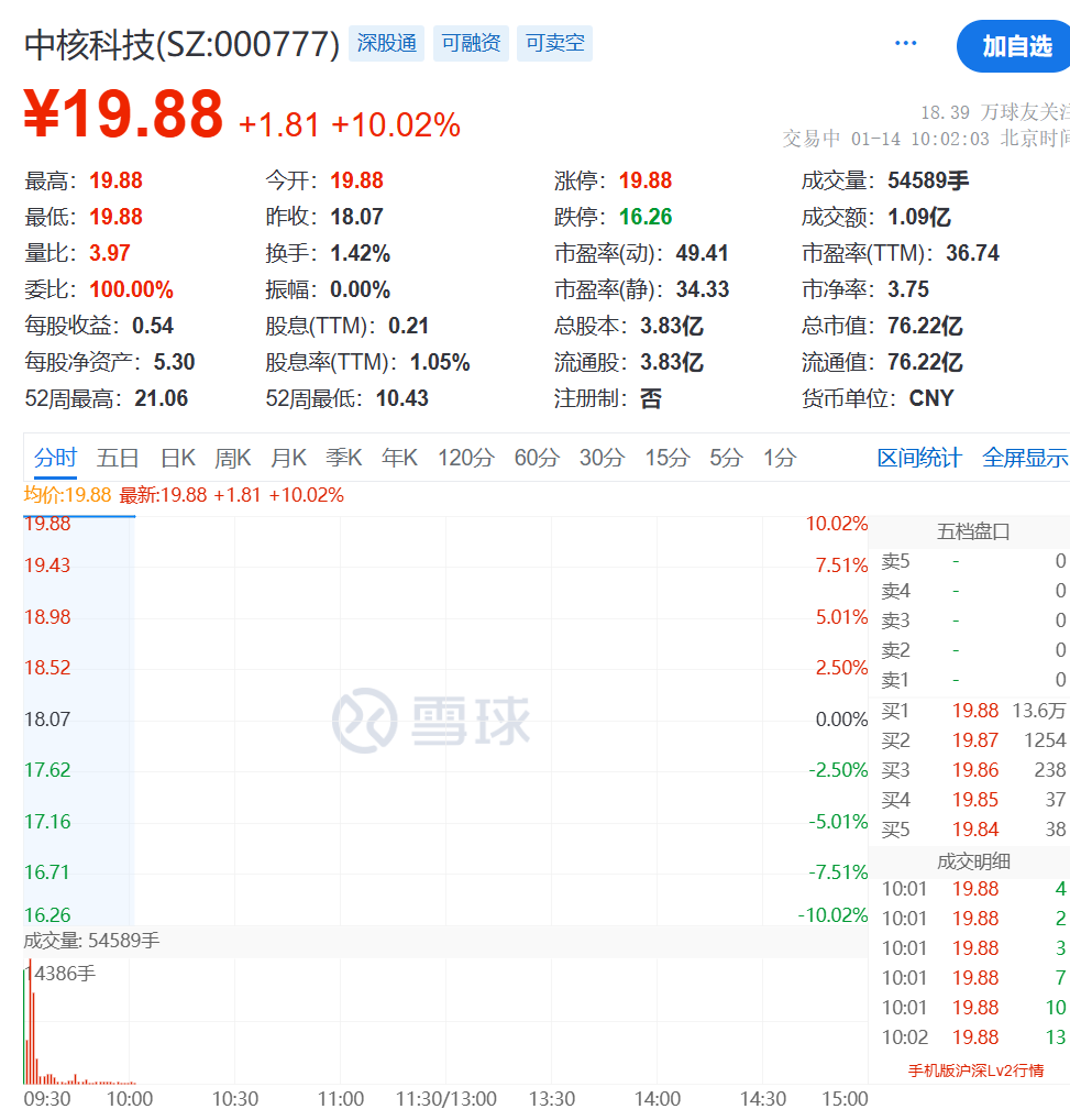 一月十四日,中核科技开盘涨停,股价为19.88元/股,涨幅为10.02%。截至发稿时,中核科技仍保持着一字涨停。