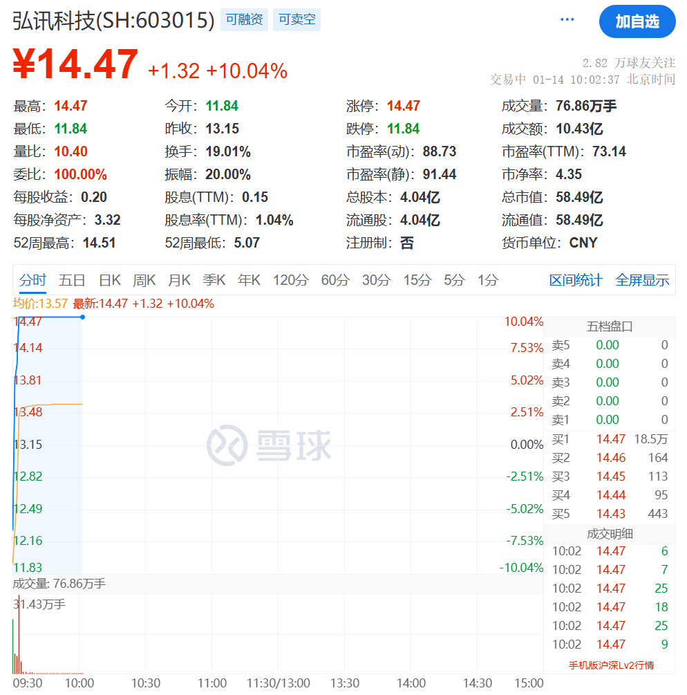 1月14日,红讯科技最近以跌停价11.84元/股开盘,随后直线上涨,4分钟封板,迅速上演“地板”。截至发稿时,红讯科技股价报14.47元/股,走出“6天5板”。