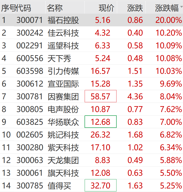 个股方面,福石控股走出20CM涨停,期待科技、引力传媒、天下秀等。率先涨停,电声股权、宣亚国际等多芯股上涨。