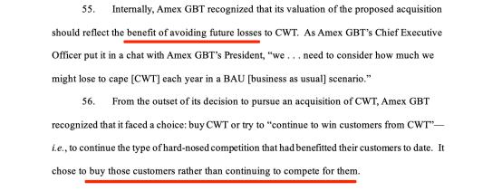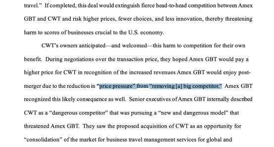 美国司法部认为,由于这种竞争,GBT最近失去了许多大型企业客户的投标机会。如果允许GBT购买CWT,这种激烈的竞争将不复存在,这可能会导致更高的价格、更少的创新和更有限的选择——这些成本最终会受到依靠旅行管理服务的企业和员工的影响,影响生产力和运营效率。