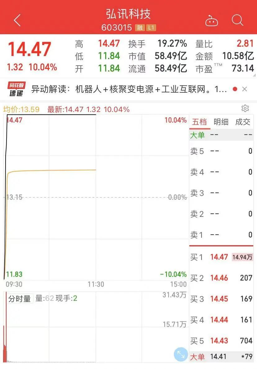 个股方面,弘讯科技开盘上演“地板”,开盘4分钟触及日线跌停。截至中午收盘,弘讯科技股价报14.47元/股,走出“6天5板”。