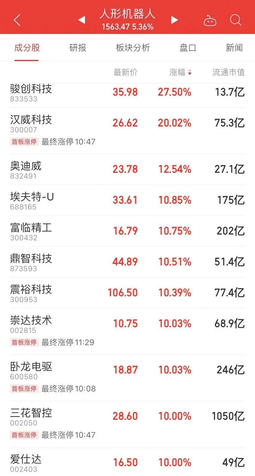人类机器人概念股持续上涨,三花智能控制、汉威科技、爱仕达、五洲春节等日线涨停。华泰证券指出,人形机器人市场一直处于高需求、低供应的状态,高智能水平的机器人供应有望创造自己的需求。建议关注高价值丝杠、触觉传感器、灵巧手部件等仍存在技术变化的阶段。