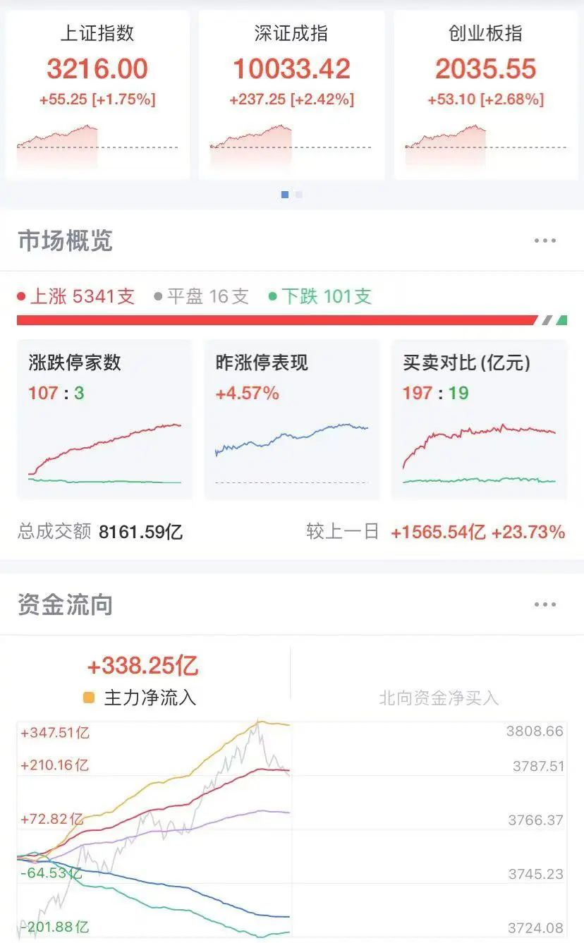 截至中午收盘,沪深三市上涨个股5341只,涨停107只,跌停101只,跌停3只。沪深三市成交额8161亿元。