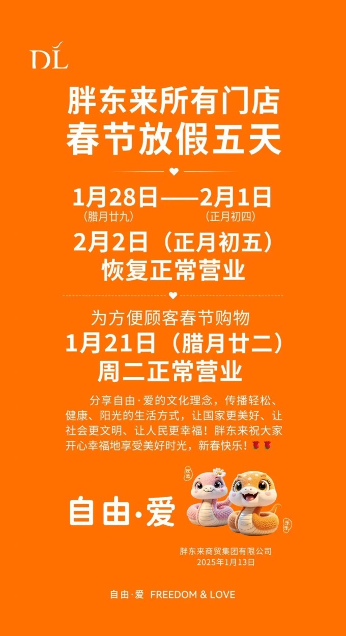 1月13日,胖东来贸易集团宣布,1月28日(农历腊月29日)至2月1日(农历正月初四),所有门店春节放假五天,2月2日(农历正月初五)恢复正常营业。同时,为了方便顾客在春节期间购物,“周二关店”于1月21日(农历腊月二)正常营业。