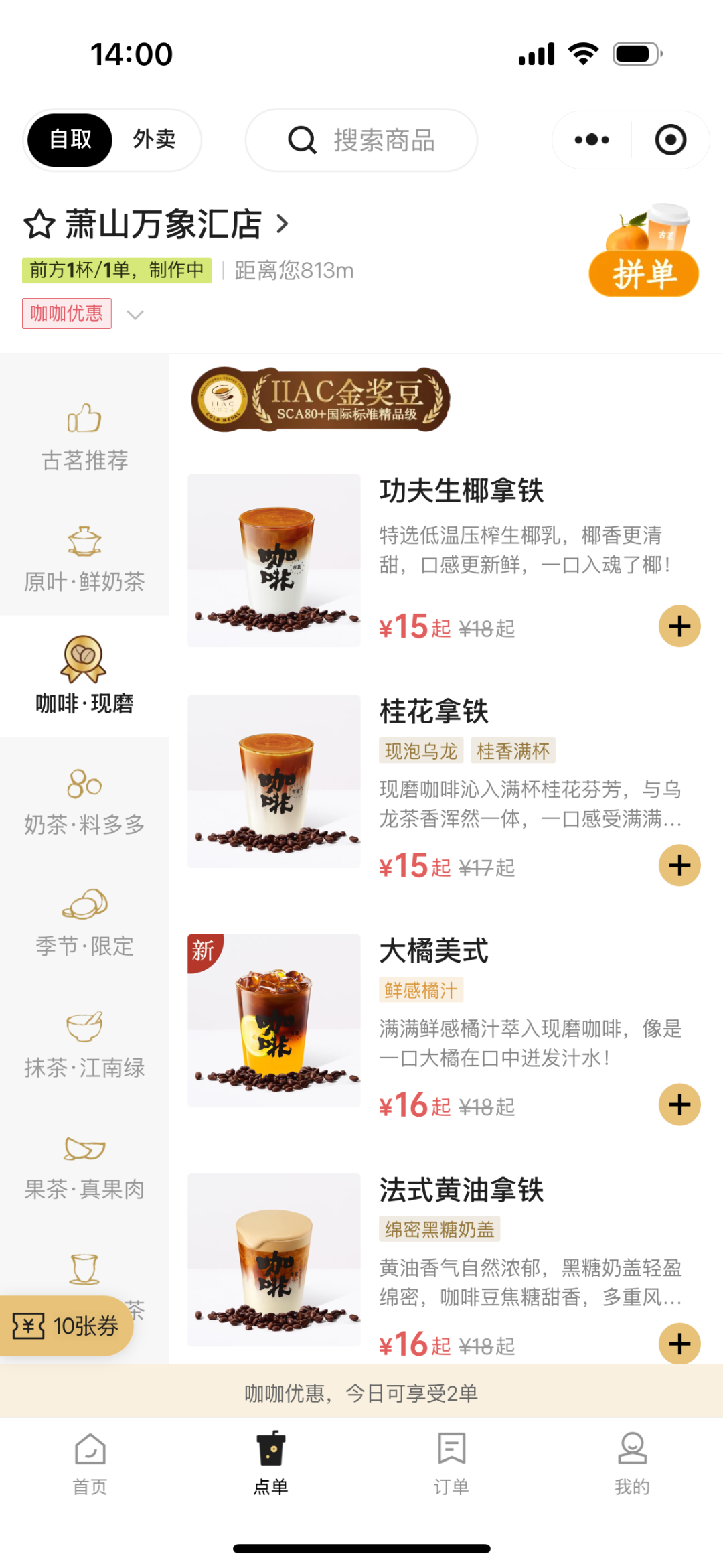 翻看古茶小程序点餐页面,古茶“咖啡现磨”系列精选IIAC金豆,精心搭配不同的新鲜原料。目前有10种产品。