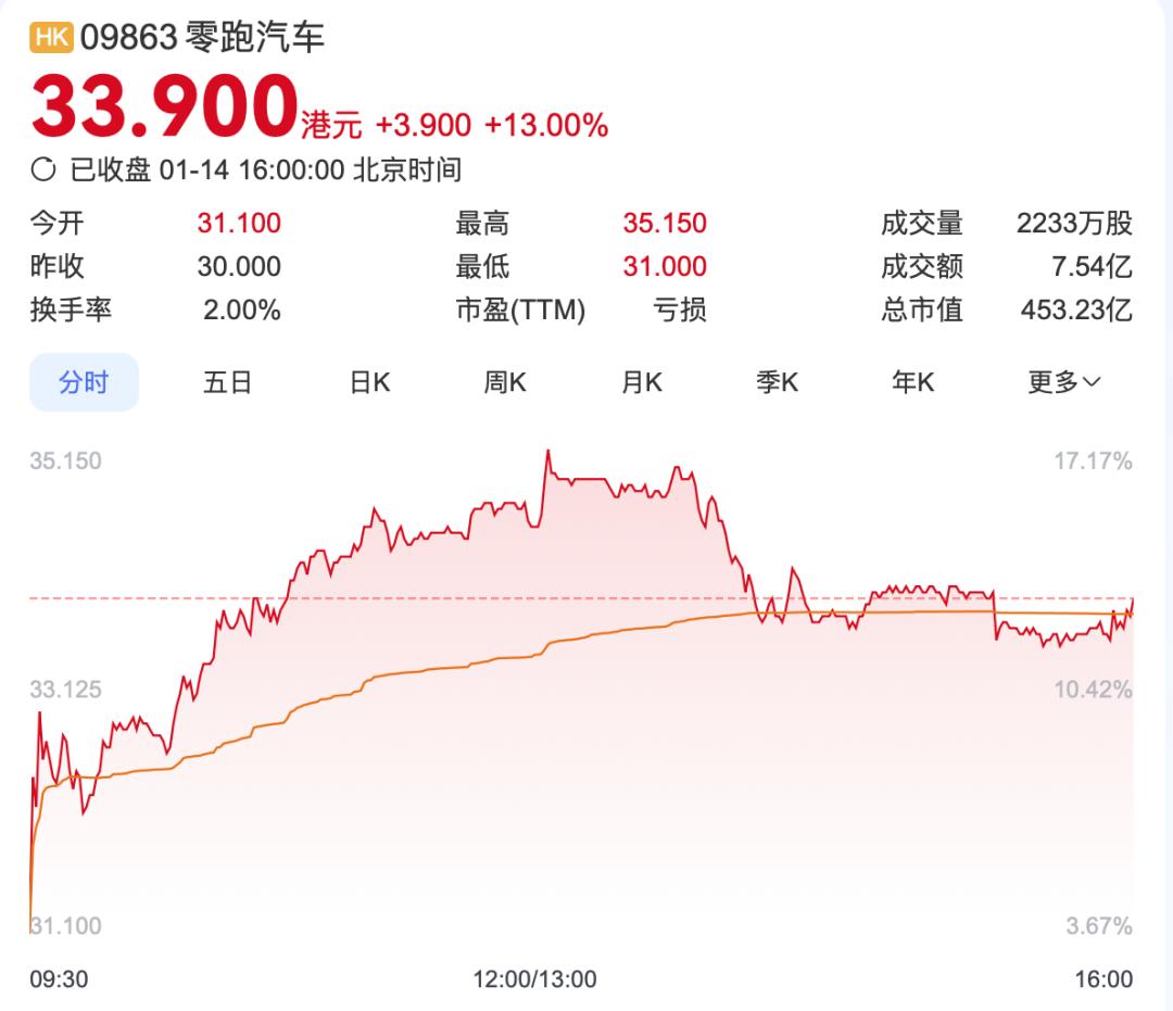 随着这一消息的增加,零跑股价暴涨13%,总市值达到453.23亿港元。