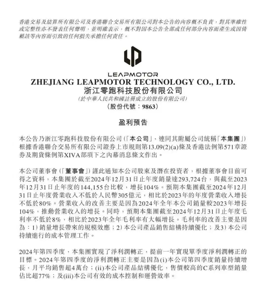 一月十三日,零跑汽车发布盈利预告,宣布2024年第四季度实现净利润转正,提前一年实现单季度盈利目标。