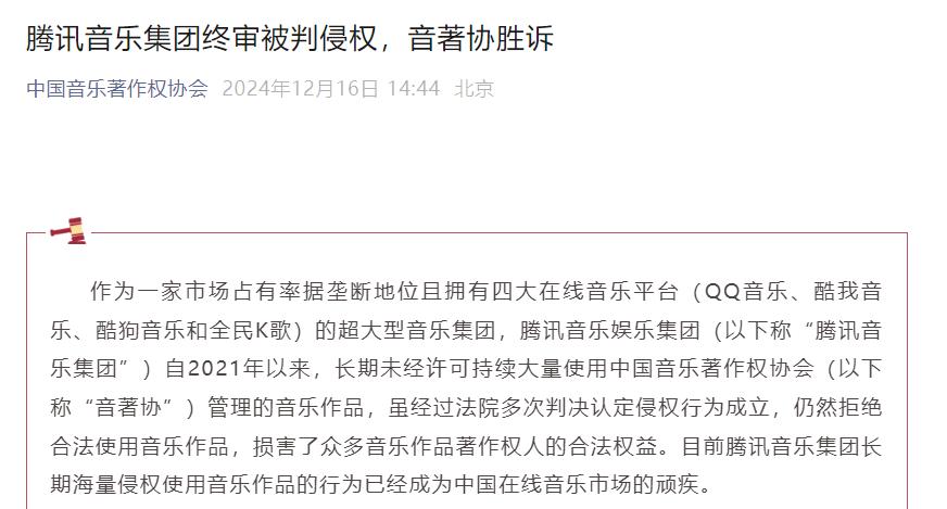 31日,中国音乐作权协会报道称,腾讯音乐因未经允许使用中国音乐作权协会(以下简称“音乐协会”)管理的音乐作品被法院判决侵权。12月16日,音乐协会刚刚发布公告,称已收到广州知识产权法院二审判决,驳回酷狗对一审结果的上诉,维持原判。