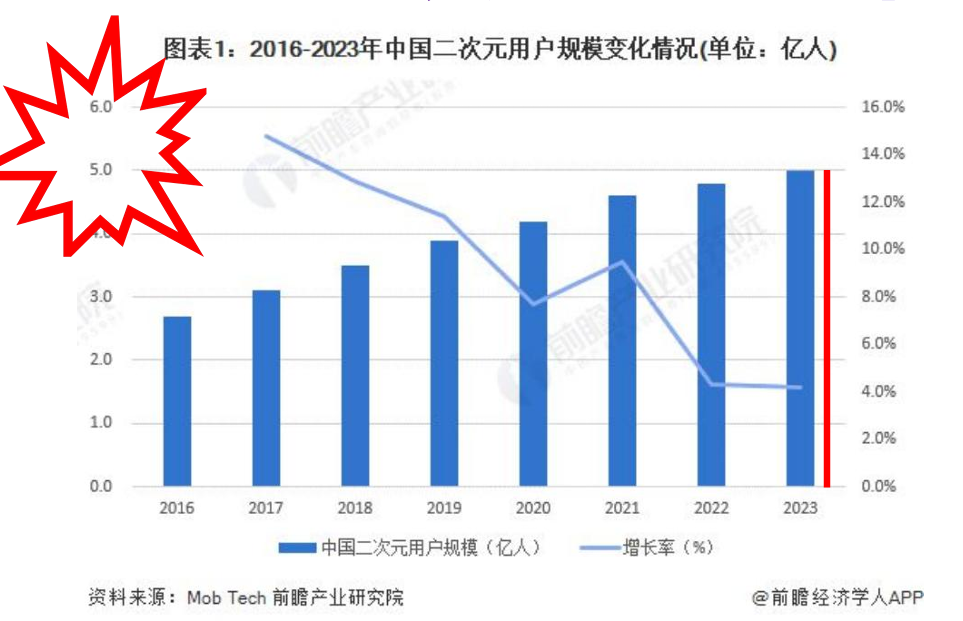 根据艾瑞的咨询数据,二次元周边衍生市场的规模已经从2016年的53亿增长到2023年的1024年 复合增长率达52.66%;前瞻性产业研究院预测,2024年中国二级产业规模将突破 稻谷经济作为二次元产业的重要组成部分,已经达到了2700亿元的市场规模。