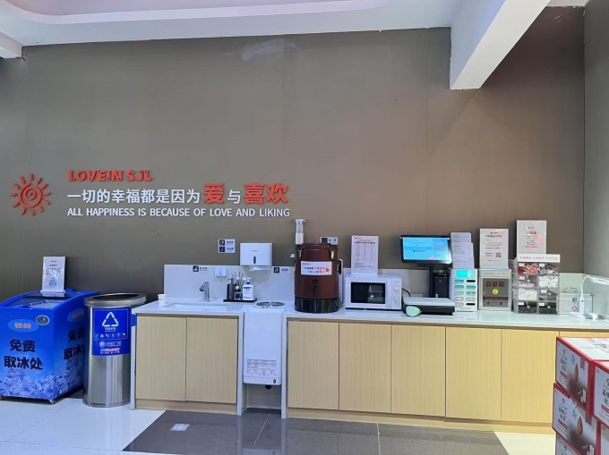同时,店内增加了烟酒柜,设置了便民服务区,为客户提供安全、方便、舒适的购物环境。在客户休息区,可以看到便民设施,如水槽、护手霜、饮用水、一次性纸杯、共享充电宝、公平秤、微波炉、一次性餐具、放大镜、药箱、自助加冰站等。,从细节上考虑客户。