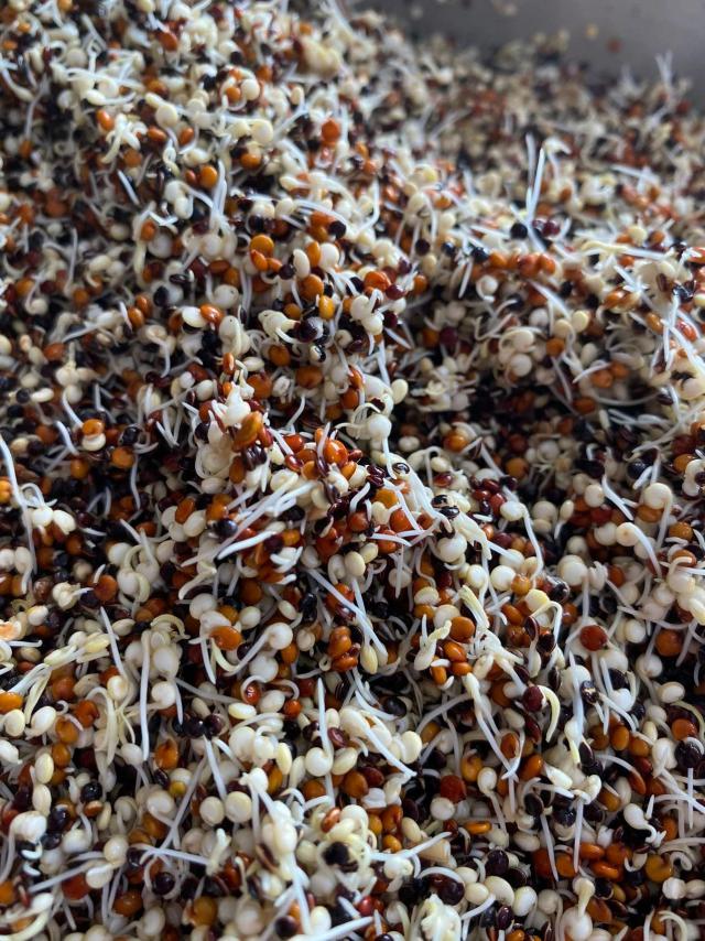 首选三色藜麦发芽,然后倒入石磨中磨浆,这个过程极其漫长。