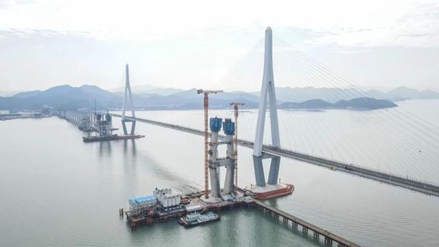 当前,象山线全线工程建设正处于全面加速阶段。全站已全面实现主体结构封顶,盾构区间全部贯通,17 座山隧道贯通。全线高架区间主体结构建设有序推进,桥梁附属结构建设逐步开展。象山线跨海大桥承台和墩基本完成,主塔柱工程进度近一半,预制梁建设开始。