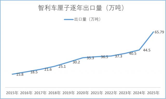 2015-2025 年度智利车厘子出口量 ( 预估 2025 每年出口量都在增加 ) (作者绘制)