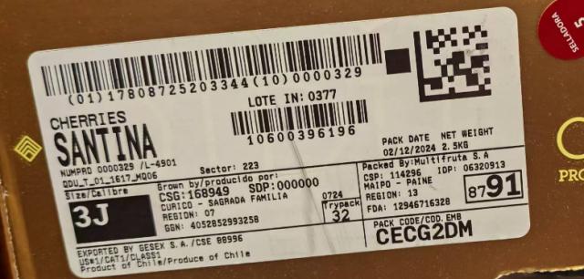 类别名称(图中方向) SANTINA,桑提娜)、产地(Chile,智利)、02/12/2024生产日期和规格 2.5kg),日期越新表示为空运,超过 30 天空表示可能是海运。