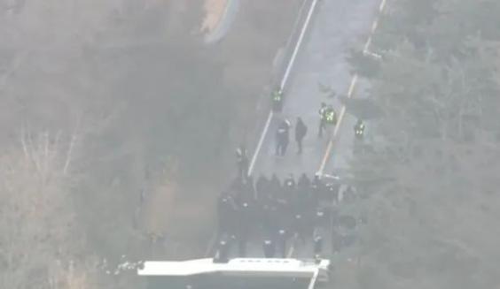 警察和公共调查人员绕过公共汽车组成的第二道拦阻线。