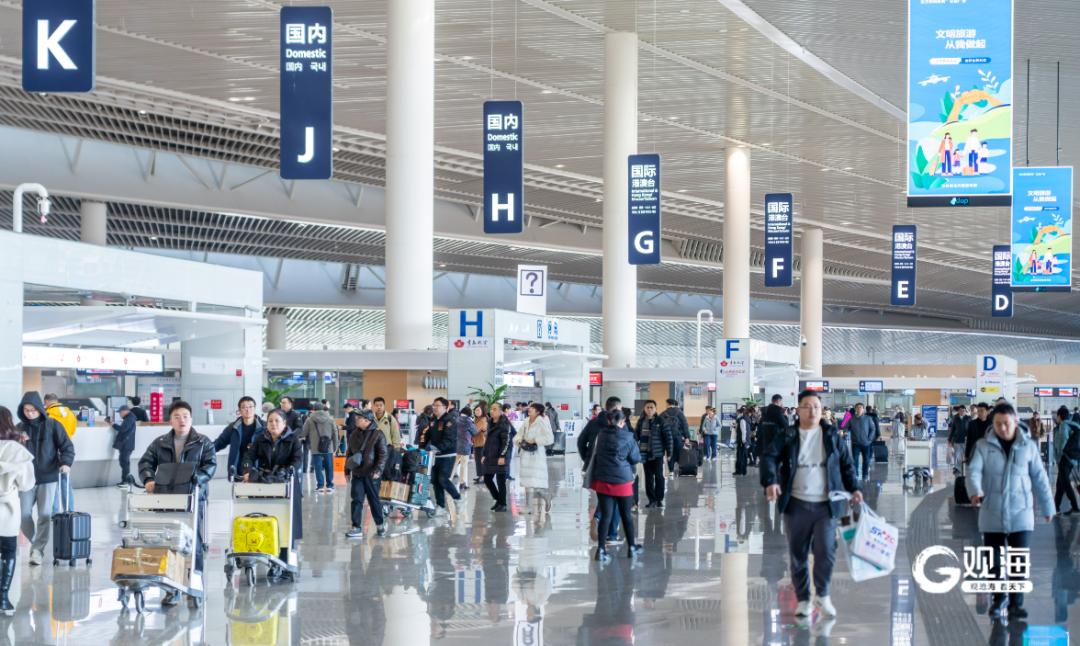 春节旅游高峰第一天,青岛胶东国际机场航站楼人流如织。