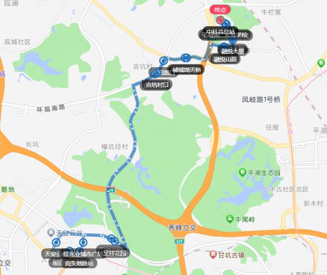 中科谷总站、平湖第二实验学校、融悦大厦、融悦山居、辅城天桥、吉坑村口、呈祥花园、天安云谷、坂田交警中队、岗头地铁站、凯撒城市广场、呈祥花园、吉坑村口、辅城天桥、融悦山居、融悦大厦、平湖第二实验学校、中科谷总站