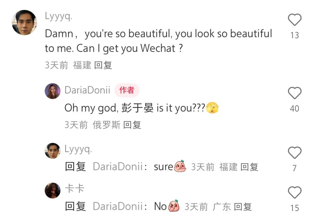 举例来说,有俄罗斯美女发完笔记后,评论区的一位中国网友,挂着彭于晏头像搭话:“你很漂亮,可以加微信吗?”