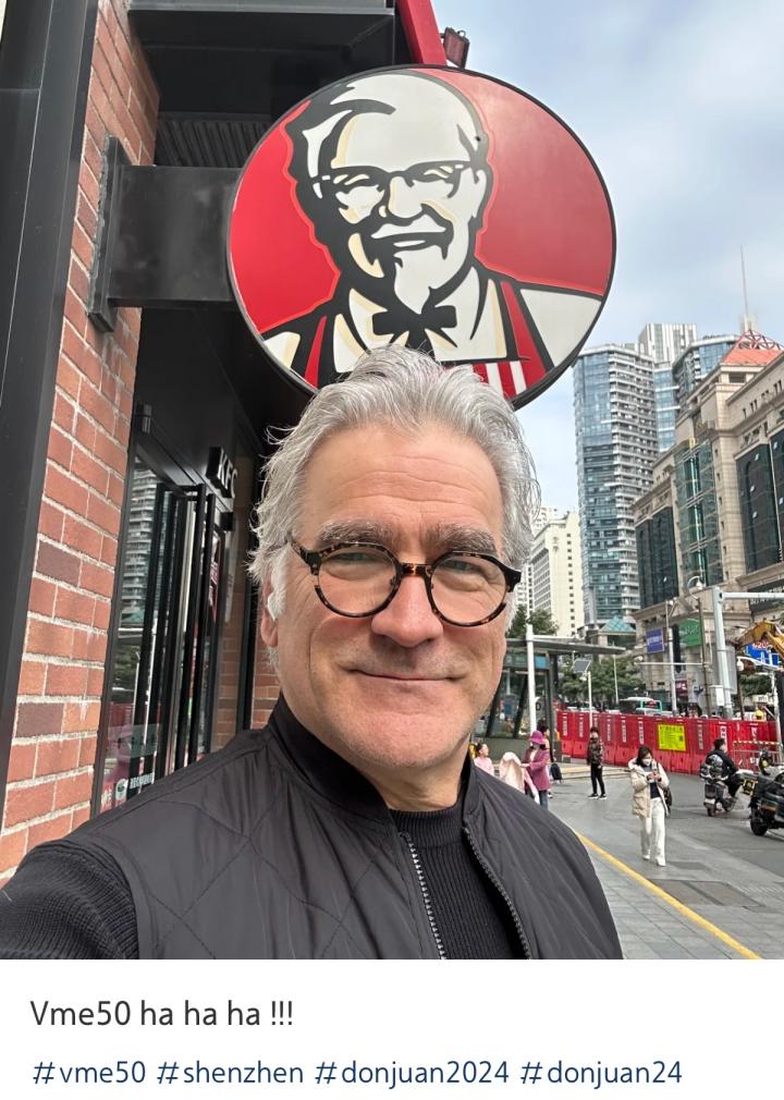 一位加拿大叔叔,在肯德基商店自拍,并配文:“V me “看起来肯德基V我50的梗,已经传到了大洋彼岸。