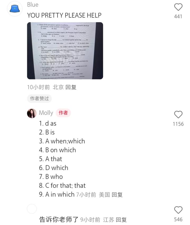 在小红书上,一位美国女孩发布ootd后,许多中国网友发布了英文试卷,并评论道:“你很漂亮,请帮帮我。”