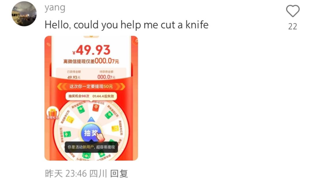一位美国网友在小红书上发布健身笔记后,立即在评论区放了拼多多现金转盘截图,说:“你能帮我砍一刀吗?”