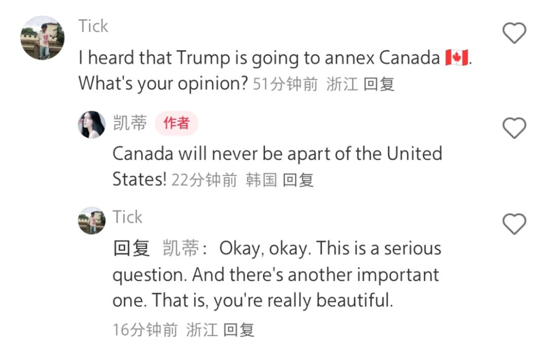 比如在一个加拿大姑娘的评论区,有中国网友问:“加拿大要不要合并到美国?”这个问题的成功激怒了美女,她承认这是绝对不可能的。