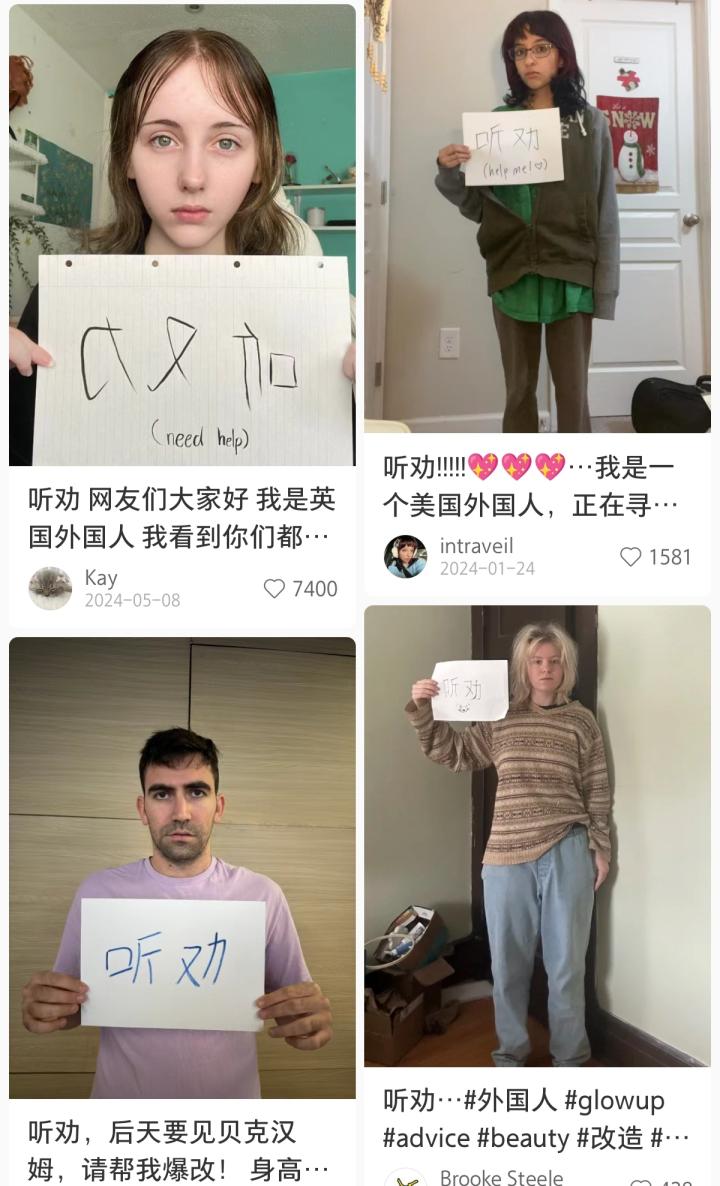 与此同时,小红书也有不少外国网友,举起写有中文“听劝告”的牌子自拍,希望中国网友热情地给他们改造美的建议。