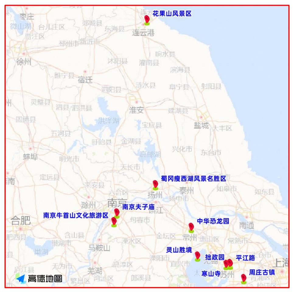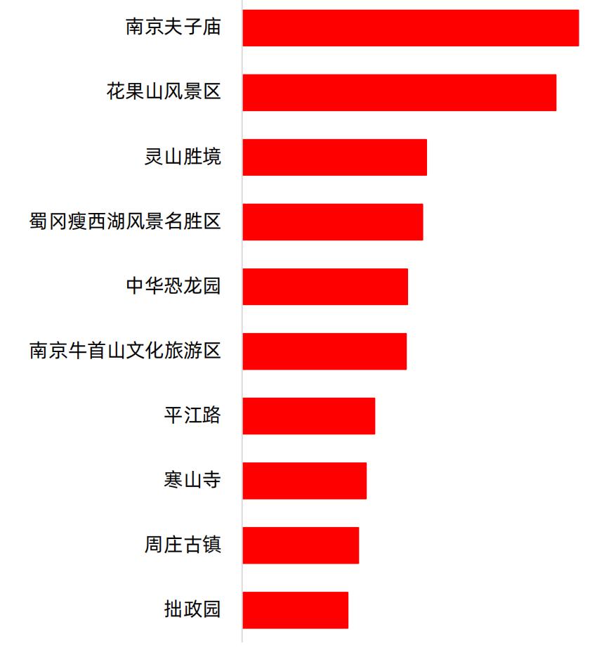 预计春节假期期间,南京夫子庙开车出行热度最高,包括花果山景区、灵山圣地、蜀岗瘦西湖景区、中华恐龙园、南京牛首山文化旅游区、平江路、寒山寺、周庄古镇、拙政园等。