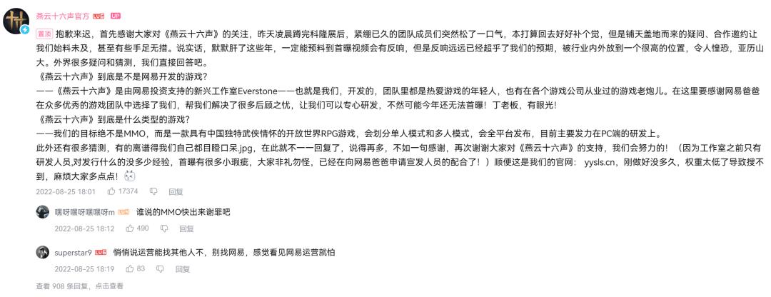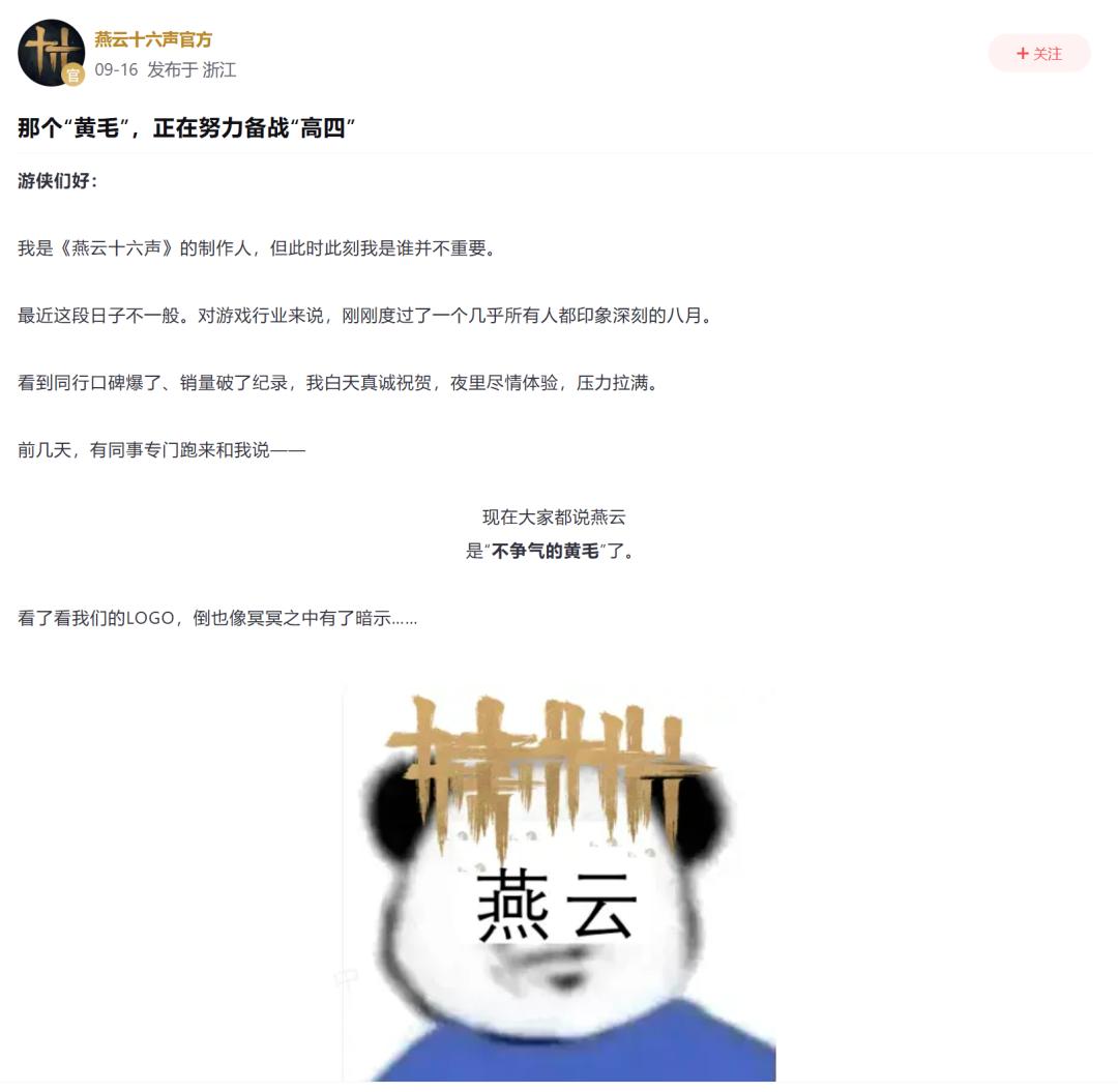 此外,游戏4测前后赶上了《黑神话:悟空》的发布,这让同样宣传“3A”品质的《燕云十六声》在对比后被戏称为“村里的黄毛”,舆论环境再次下滑。“暴死”的言论在网上开始出现。
