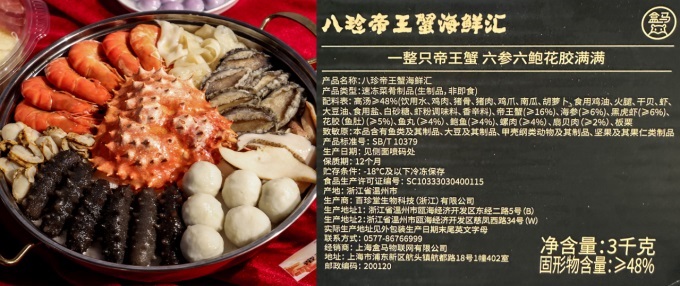今年,盒马在更多年的新菜品中使用了这种辣椒五花肉鸡的原汤冷冻技术,如今年八珍帝王蟹海鲜汇、乳白鱼头汤等。为了让大家了解这些大菜的配料表,盒马的R&D和采购人员应该在菜品研发阶段尽量减少额外的添加,甚至在选择调味品时也非常谨慎。
