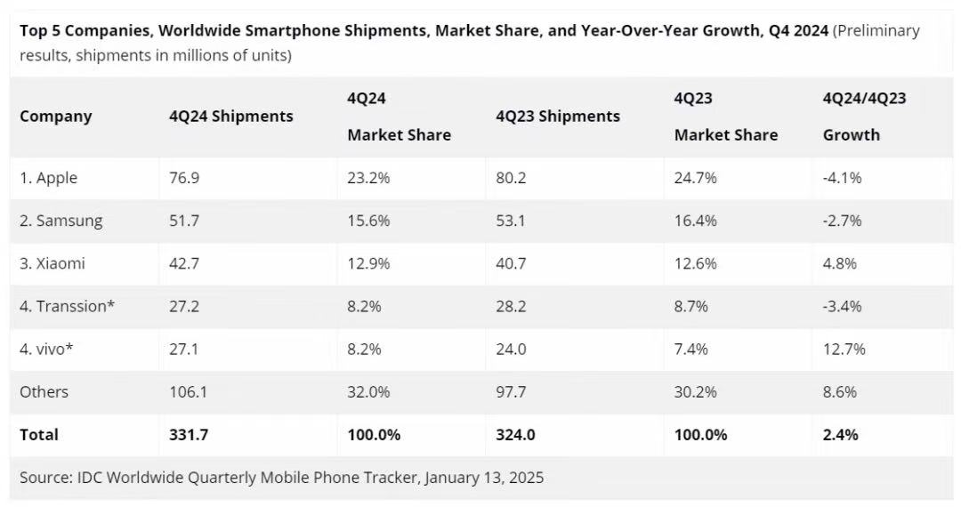 近日,市场调研机构IDC发布了2024年第四季度全球智能手机出货量报告,前五名是苹果、三星、小米、传音和vivo。本季度,全球智能手机总出货量同比增长2.4%,共计3.317亿部。