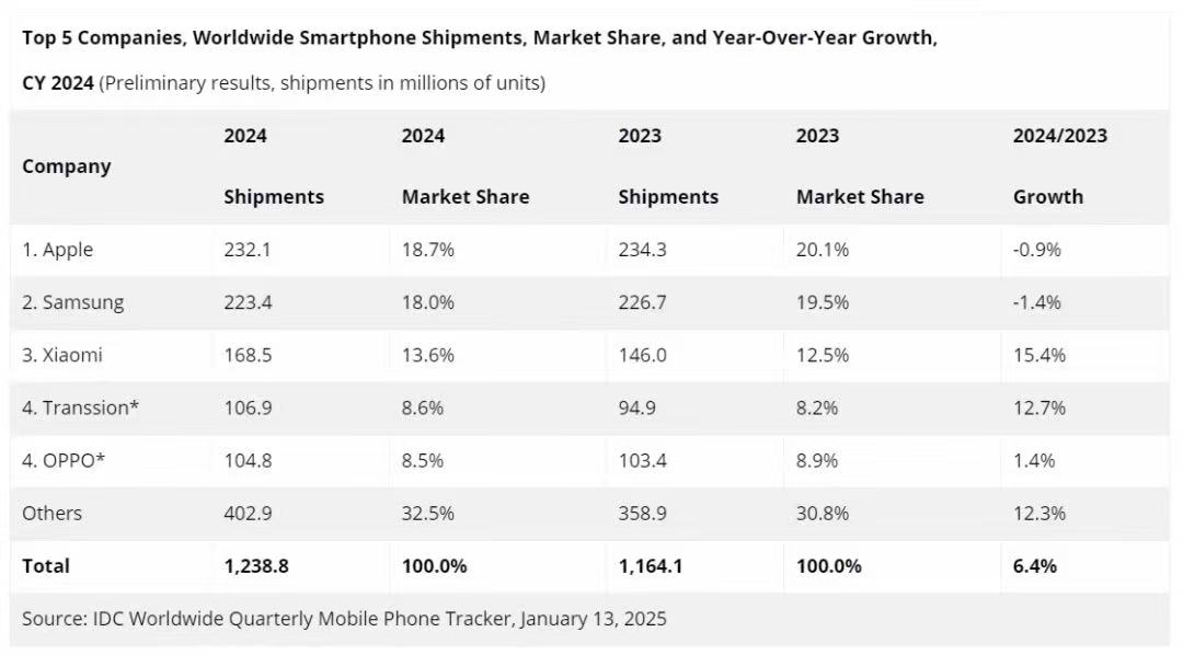 在2024年智能手机市场报告中,市场调研机构IDC指出,2024年对中国手机制造商来说是一个里程碑。根据2024年全年智能手机综合出货量报告,苹果、三星、小米、传音、OPPO排名前五,中国厂商份额已达56%。