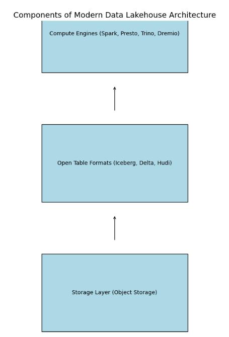 现代湖仓一体化结构以存储层、开放式表格式和计算引擎三个关键部件为基础。