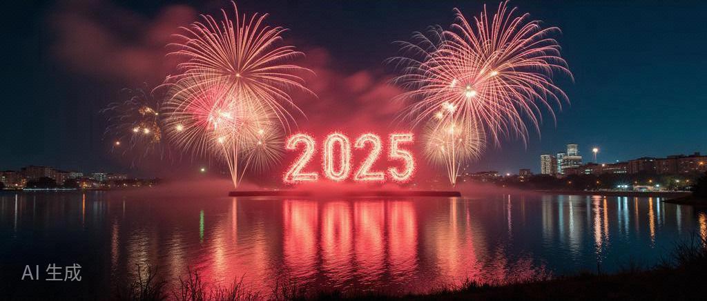 提示词:新年钟声敲响的瞬间,绚烂的烟花在夜空中绽放,映照在平静的城市湖泊上,烟花组成了文字“2025”。