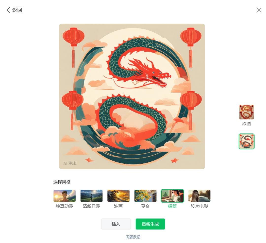 换风格再生成的图片与原图会有所不同,比如我们选择极简风格重新生成这张蛇年海报,元素和构图与原图基本相似,但少了数字2025。