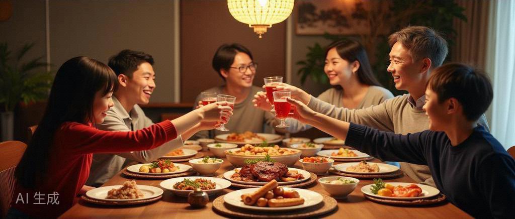 提示词:全家人围坐在摆满丰盛菜肴的大圆桌旁,有炖好的红烧肉、新鲜的蒸鱼、冒着香气的炖鸡,大家举杯共饮,春节氛围。
