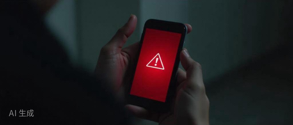 提示词:电话铃声响起,手机屏幕上显示着一个大大的红色警示标志,恐怖的氛围。