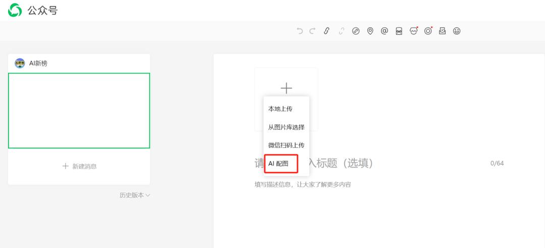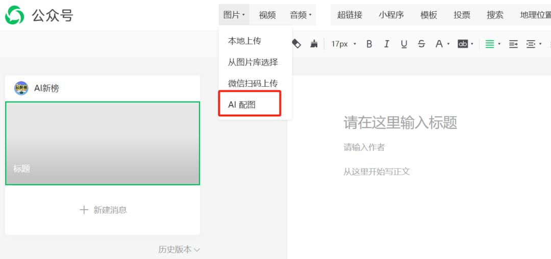 然后,选择创建一篇新的文章,在菜单栏的“图片”下拉选项中,可以看到“AI配图”入口,这里生成的图片可以插入文中作为配图。