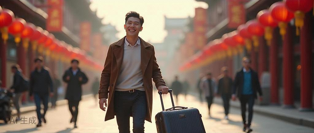 提示词:穿着时尚的中国年轻人拖着行李箱走在县城街道上,脸上带着归乡的喜悦和急切,春节氛围。