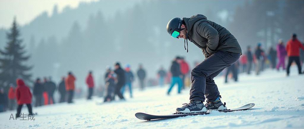 提示词:在人潮涌动的滑雪场中,一个初学者站在单板滑雪板上差点摔跤的瞬间,身体摇晃,中景。