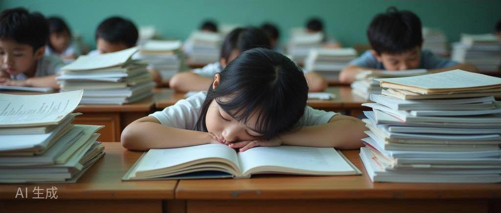 提示词:孩子坐在书桌前睡着了,作业堆积如山,几乎要把孩子埋没了,透露出一种疲惫压抑的情绪。