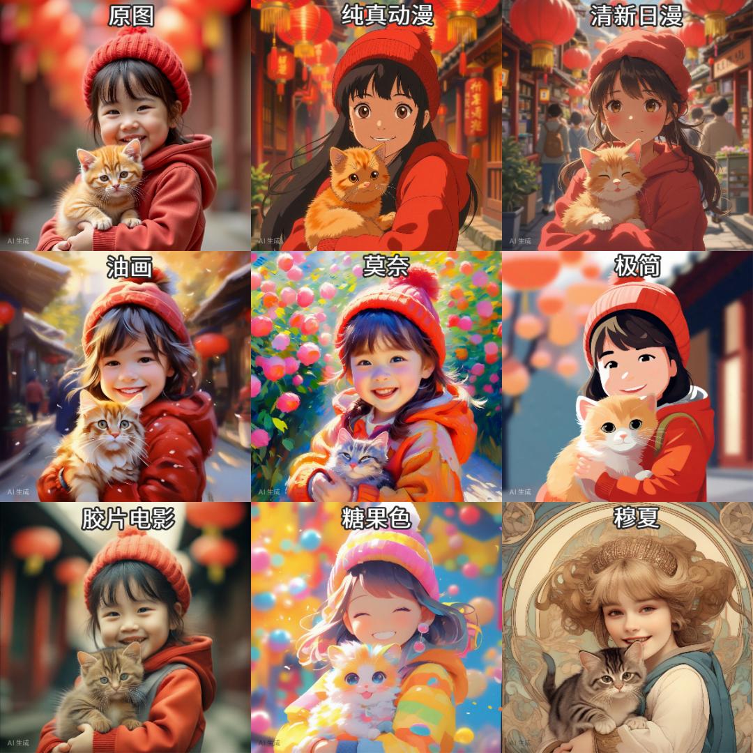 我们以“一个穿着汉服的小女孩正在河边看烟花,露出灿烂的笑容,冬日夜晚”为例,可以看到不同风格的效果对比。