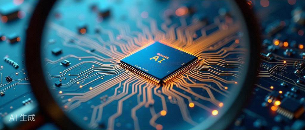 提示词:放大镜下的AI芯片,金色的电路线条在蓝色的硅基上错综复杂地排列,一些微小的晶体管像小方块一样整齐地镶嵌其中。