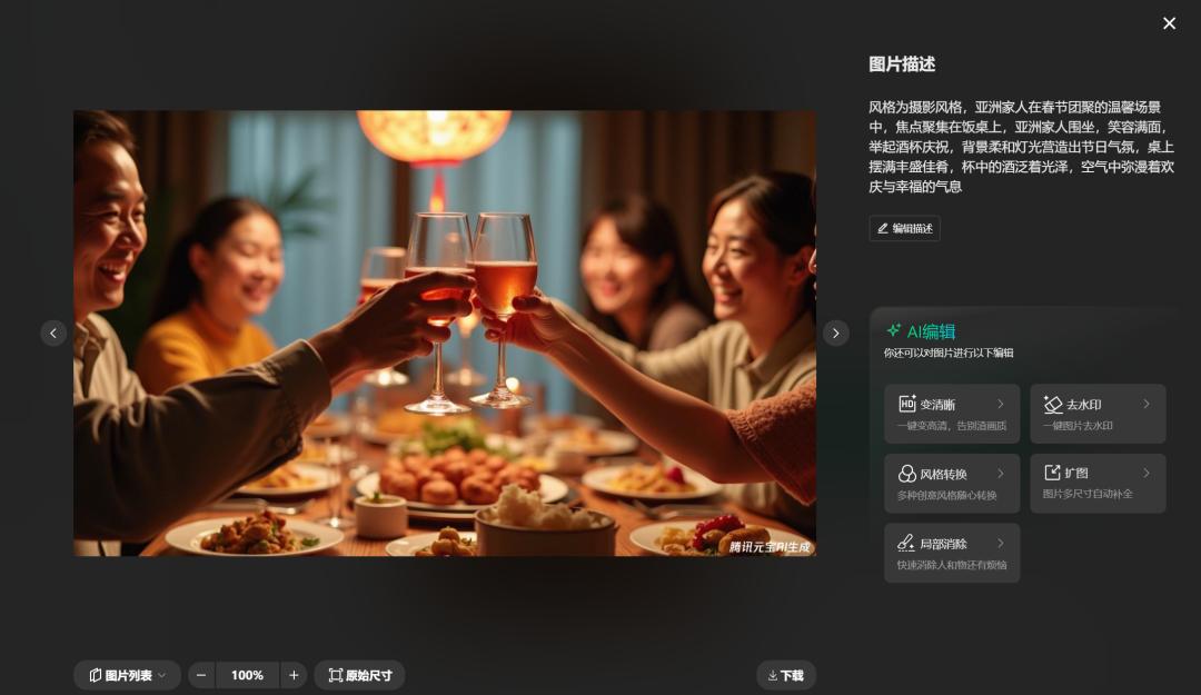 建议有余力的朋友可以多使用腾讯元宝的AI画图(https://yuanbao.tencent.com/),功能更丰富,包括图生图,扩图、局部消除、去水印等AI编辑功能,分辨率也可以选择超清,还提供了33种风格模板。