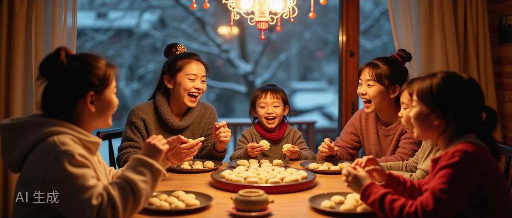 提示词:一家人围坐在一起包饺子,大家欢声笑语,窗外是白雪皑皑的新年夜景。