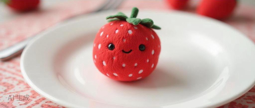 提示词:一个可爱的草莓造型的毛绒玩偶,毛茸茸的质感,放在白色的餐盘上,像jellycat一样有小小的眼睛和微笑的表情。